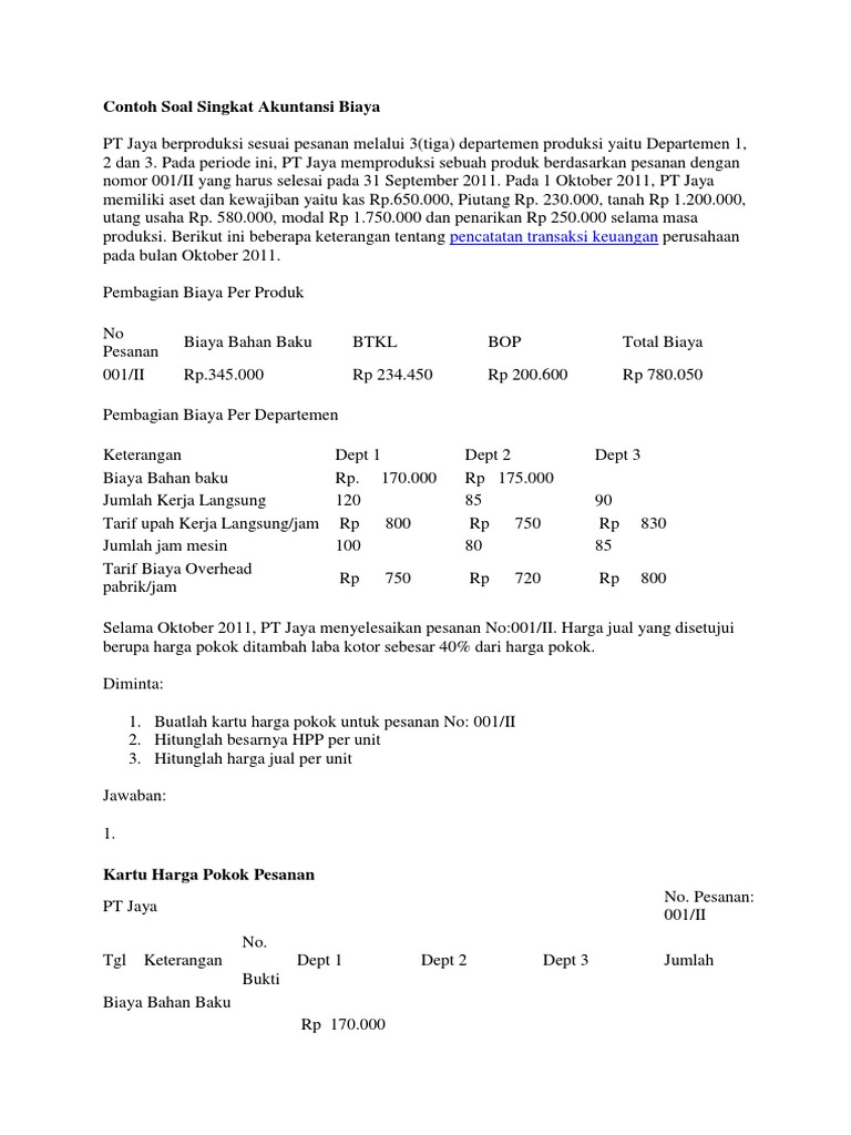 Soal Dan Jawaban Akuntansi Biaya - 15 Contoh Soal Pilihan Ganda Akuntansi Perusahaan Manufaktur Dan Jawabannya Pilihan Ganda - Soal dan jawaban uts akuntansi biaya.. Soal latihan i soal jawab perusahaan manufaktur perusahaan memproduksi barang dan menggunakan metode pesanan untuk menghitung harga pokok produksinya. Soal ujian ut akuntansi ekma4315 akuntansi biaya dan kunci jawaban oleh soalut.com februari 21, 2019 soal ut akuntansi ekma4315 akuntansi biaya dilengkapi kunci jawabannya kami bagikan sebagai bahan belajar yang efektif untuk anda sebelum uas dilaksanakan. Contoh soal singkat akuntansi biaya pt jaya berproduksi sesuai pesanan melalui 3 tiga departemen produksi yaitu departemen 1 2 dan 3. Jelaskan perbedaan biaya tetap biaya variable dan biaya semi variable. Contoh soal dan jawaban perhitungan biaya berdasarkan pesanan akan melibatkan job order costing.